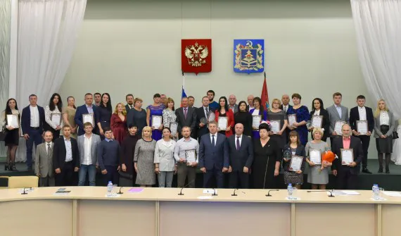 В торжественной церемонии, проходившей в Хрустальном зале, приняли участие руководители области, начальники профильных ведомств и виновники торжества.