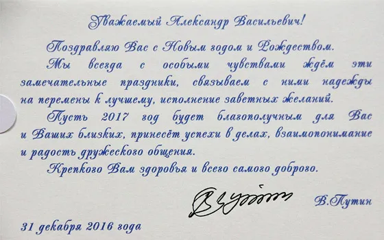 В поздравлении Главы государства говорится: «Уважаемый Александр Васильевич! Поздравляю Вас с Новым годом и Рождеством. Мы всегда с особым чувством ждем эти замечательные праздники, связываем с ними надежды на перемены к лучшему, исполнение заветных желаний. Пусть 2017 год будет благополучным для Вас и Ваших близких, принесет успехи в делах, взаимопонимание и радость дружеского общения. Крепкого вам здоровья и всего самого доброго».