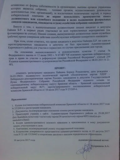 Основной причиной подачи заявления, является использование, по мнению Куприянова, залетным кандидатом административного ресурса. Это он и указал в заявлении подробно расписав, как Пайкин постоянно приглашается на все административные мероприятия местными чиновниками.