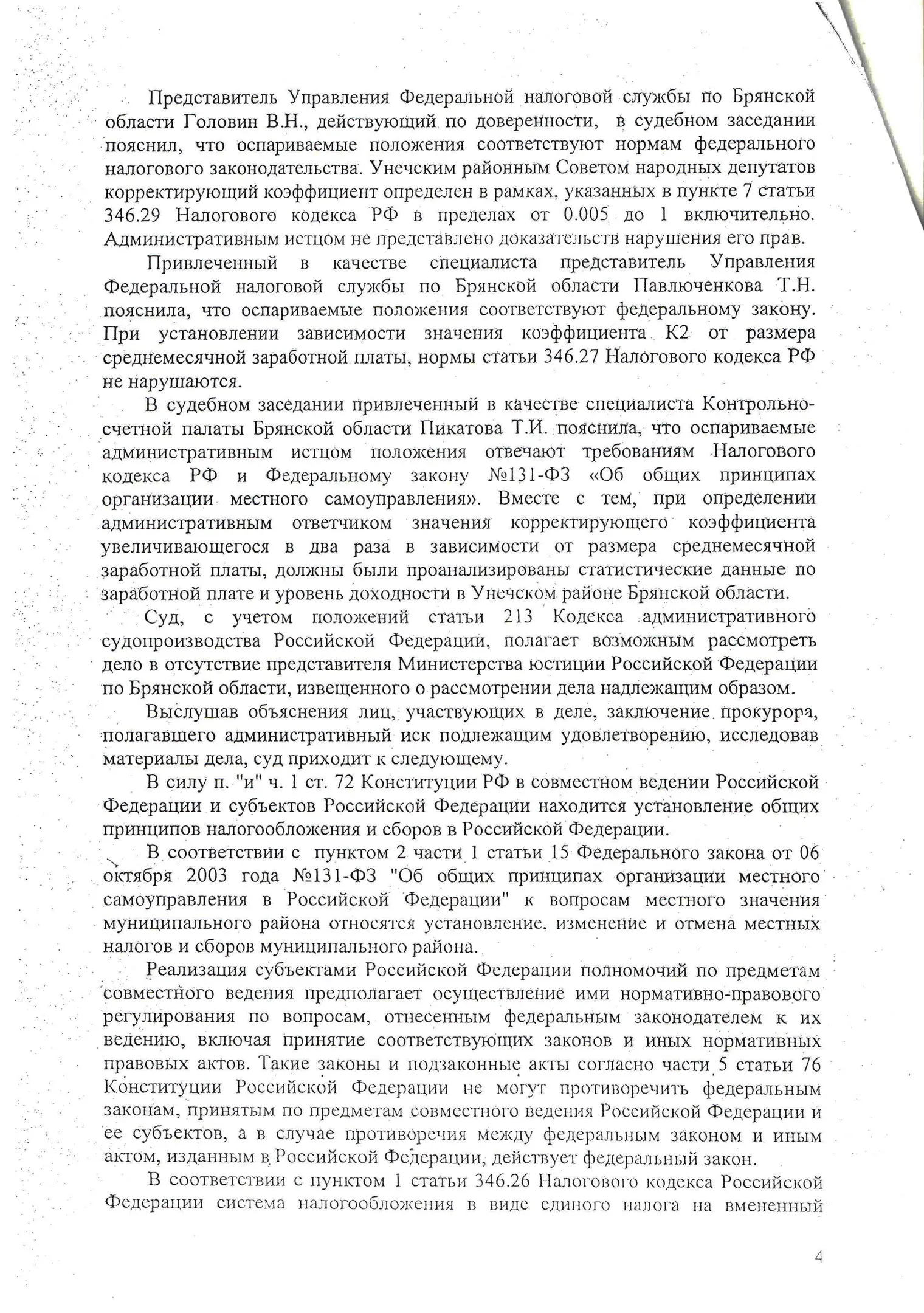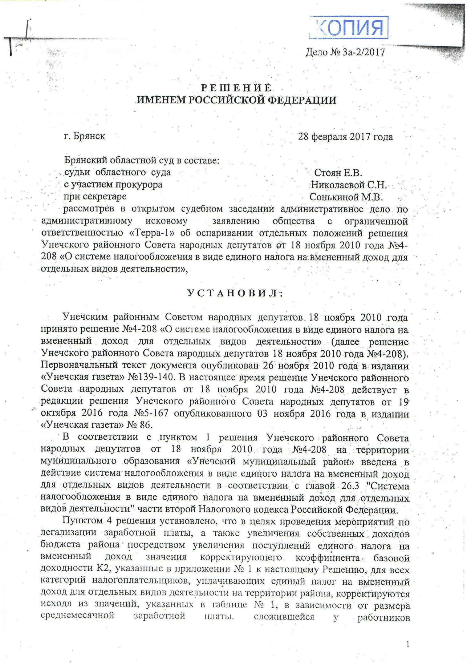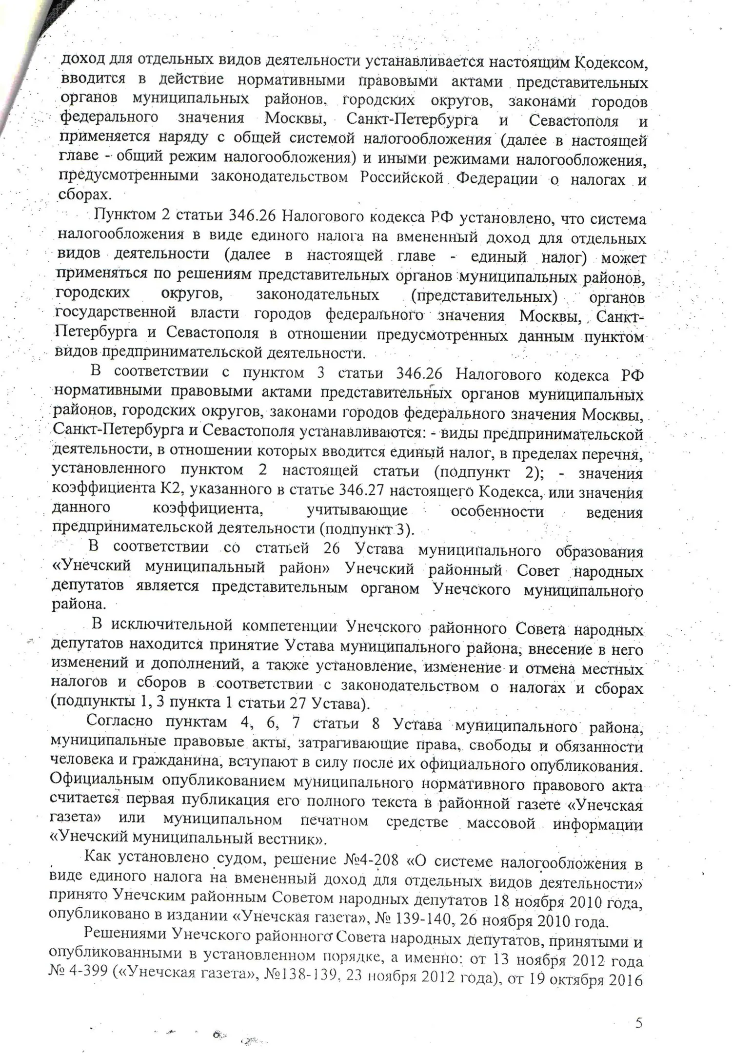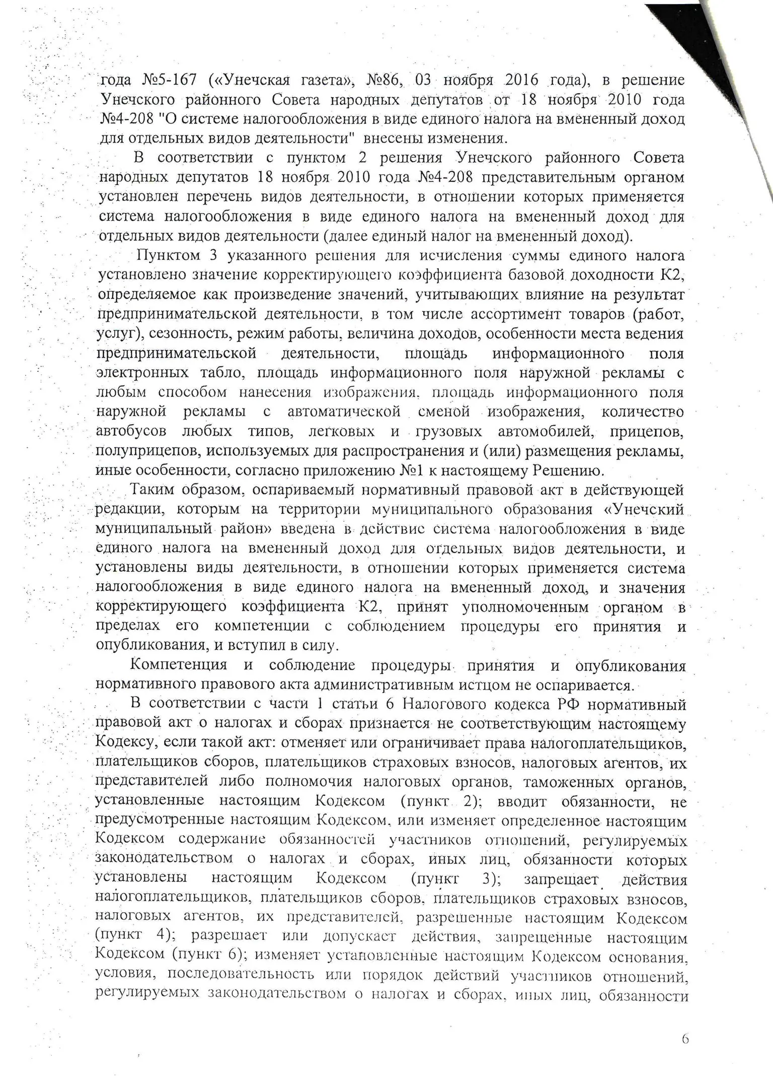 В конце 2016 г. мне пришлось участвовать в судебном оспаривании решения Унечского районного Совета народных депутатов от 18.11.2010 г. № 4-208 «О системе налогообложения в виде единого налога на вмененный доход для отдельных видов деятельности» в части пункта 4, содержащего вышеназванное правило. Дело рассматривалось в областном суде по первой инстанции. Ответчик (районный СНД), возражая против иска, ссылался также на то, что данный муниципальный правовой акт прошел экспертизу и не вызвал никаких замечаний у прокуратуры. Эти доводы были поддержаны представителями ФНС по Брянской области. Тем не менее суд признал данное решение в оспариваемой части противоречащим федеральному законодательству и недействующим. Верховный Суд РФ данное решение оставил в силе, отказав райсовету в удовлетворении его апелляционной жалобы.