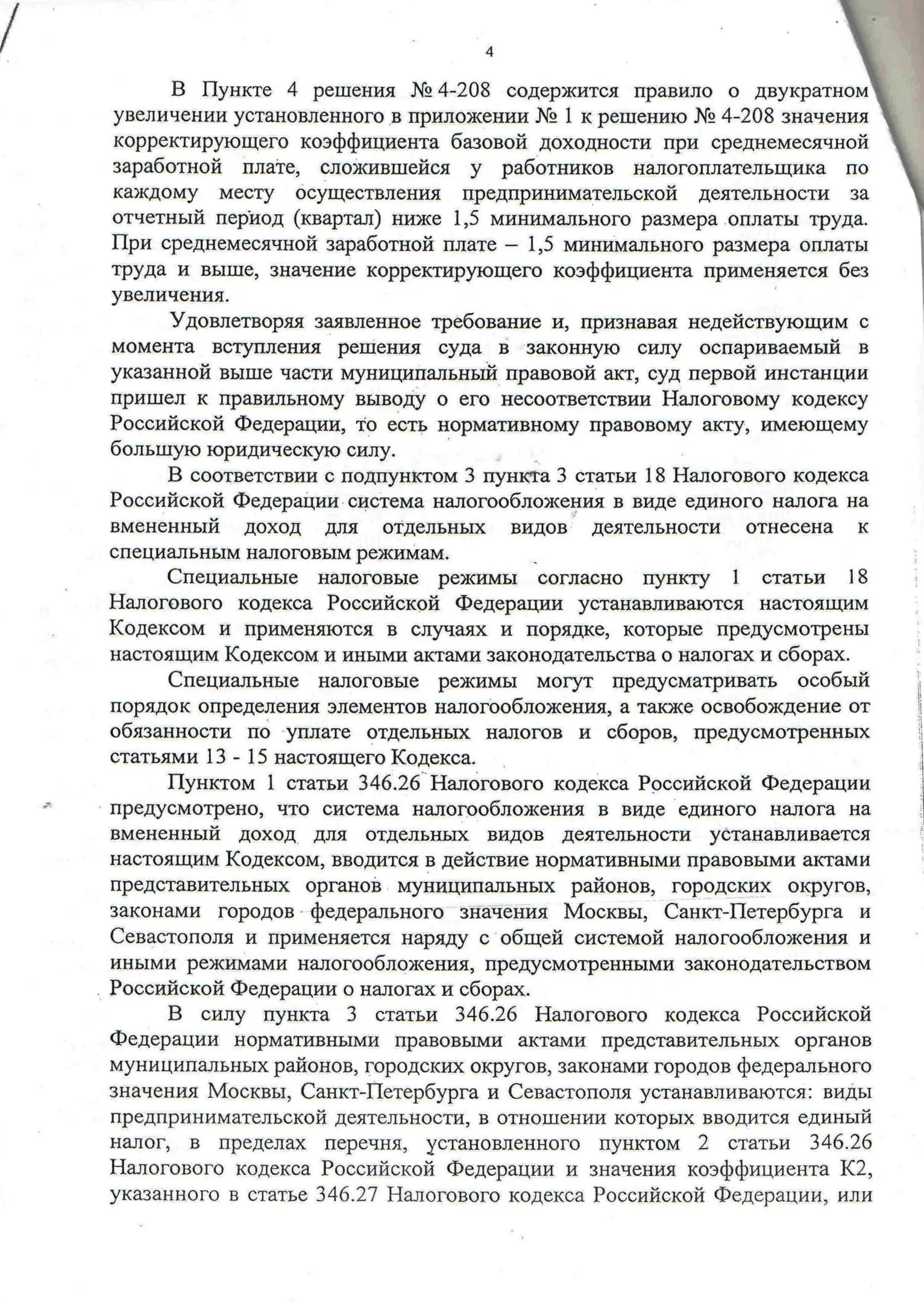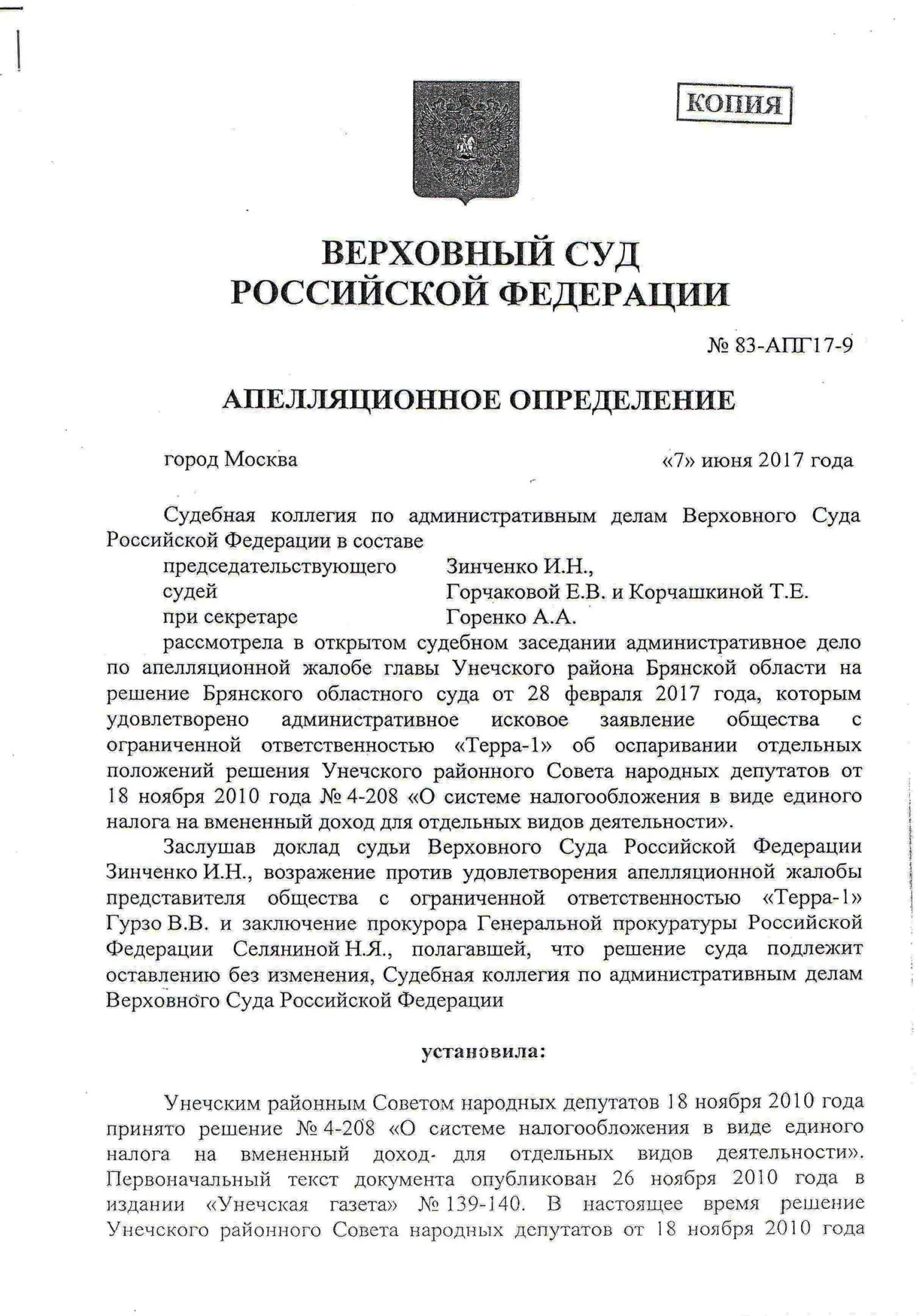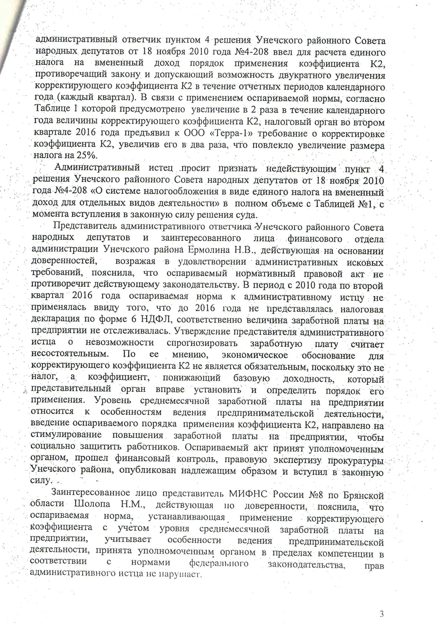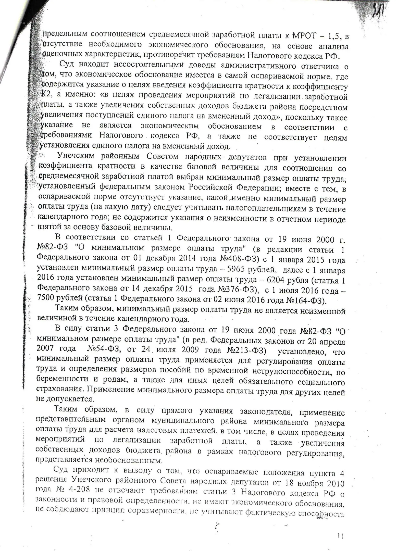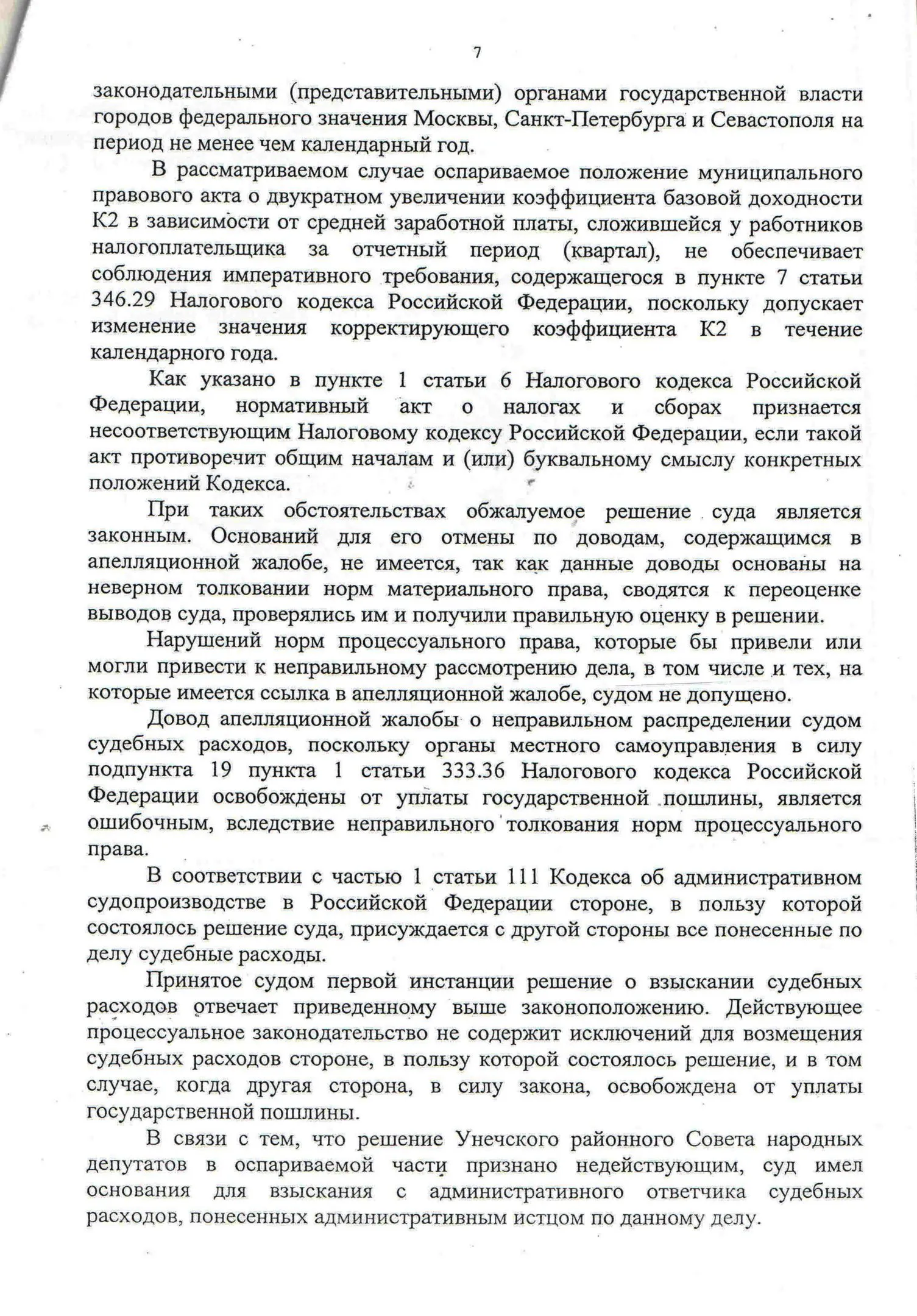 В конце 2016 г. мне пришлось участвовать в судебном оспаривании решения Унечского районного Совета народных депутатов от 18.11.2010 г. № 4-208 «О системе налогообложения в виде единого налога на вмененный доход для отдельных видов деятельности» в части пункта 4, содержащего вышеназванное правило. Дело рассматривалось в областном суде по первой инстанции. Ответчик (районный СНД), возражая против иска, ссылался также на то, что данный муниципальный правовой акт прошел экспертизу и не вызвал никаких замечаний у прокуратуры. Эти доводы были поддержаны представителями ФНС по Брянской области. Тем не менее суд признал данное решение в оспариваемой части противоречащим федеральному законодательству и недействующим. Верховный Суд РФ данное решение оставил в силе, отказав райсовету в удовлетворении его апелляционной жалобы.