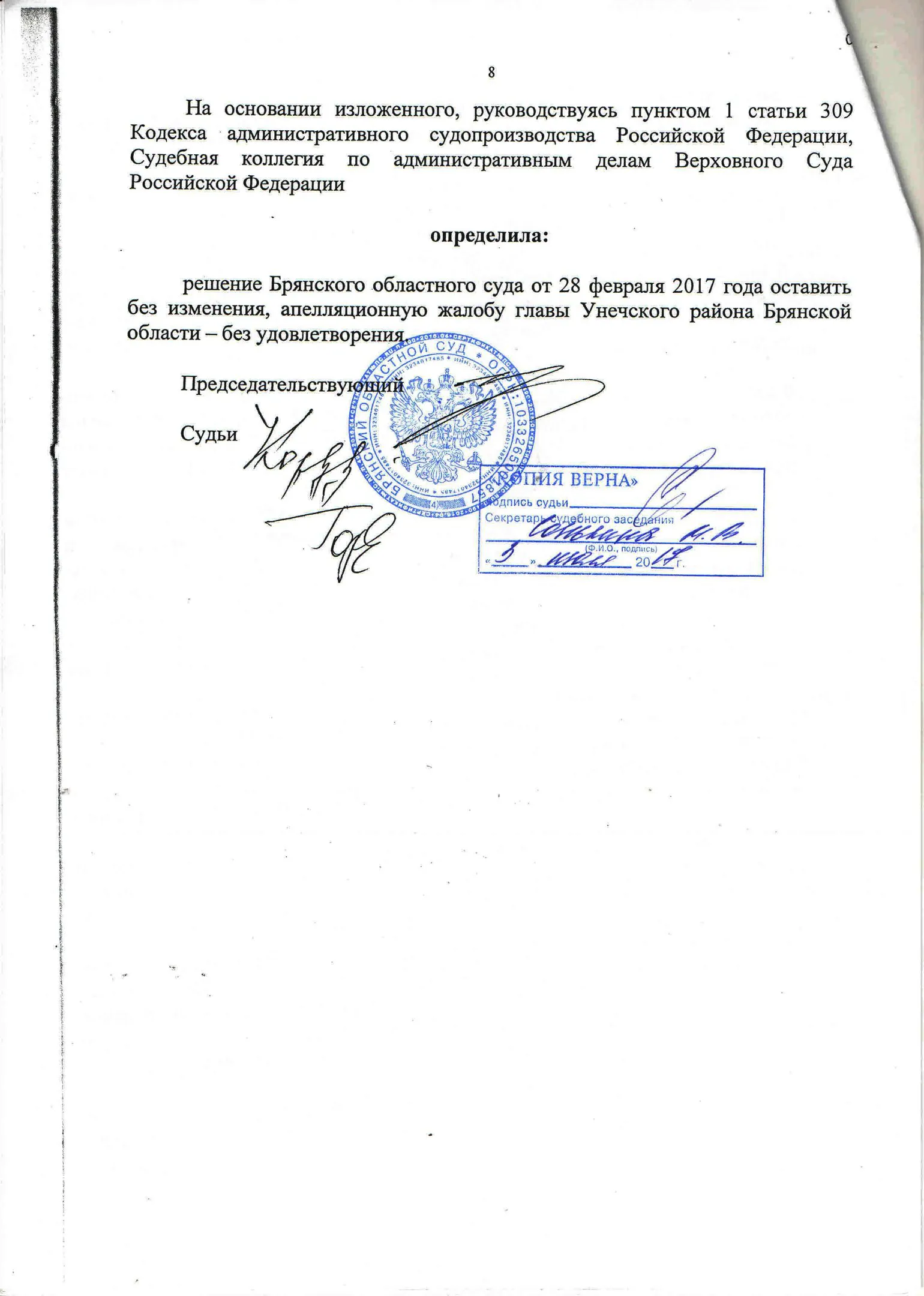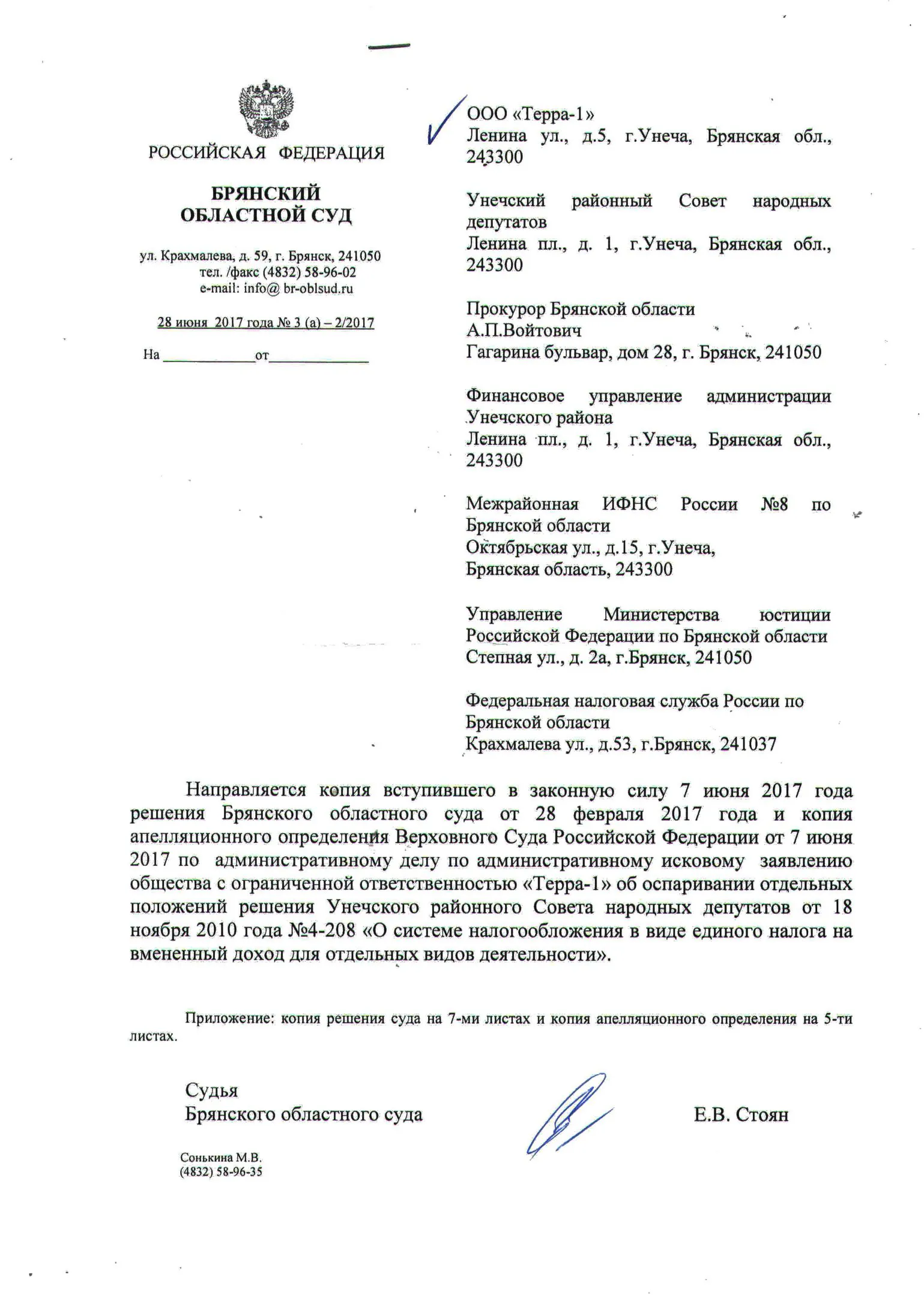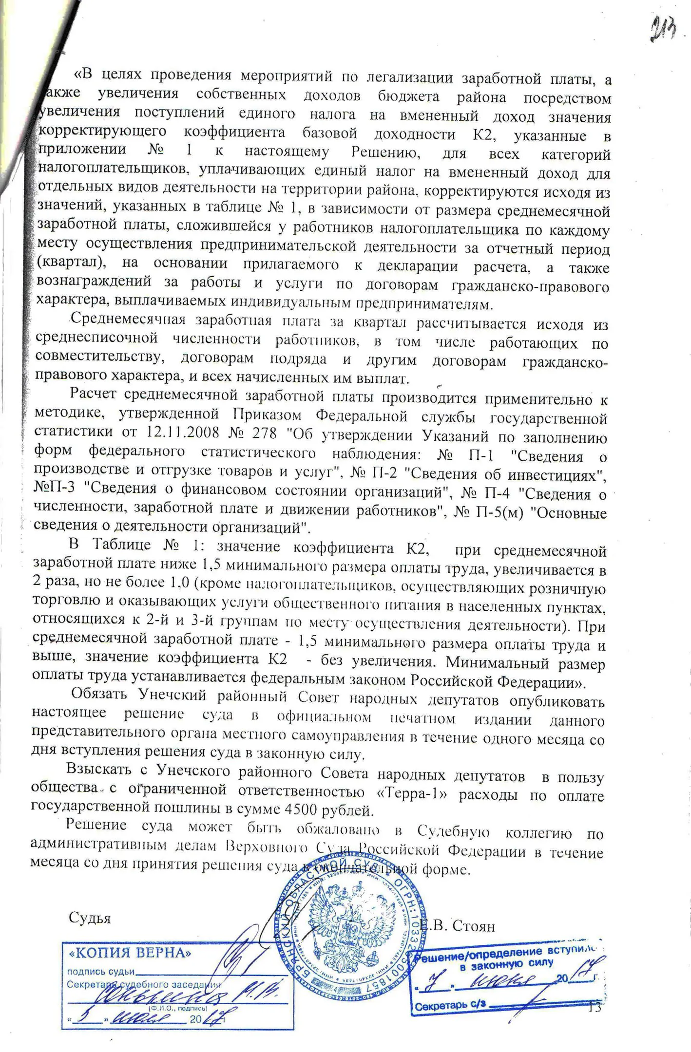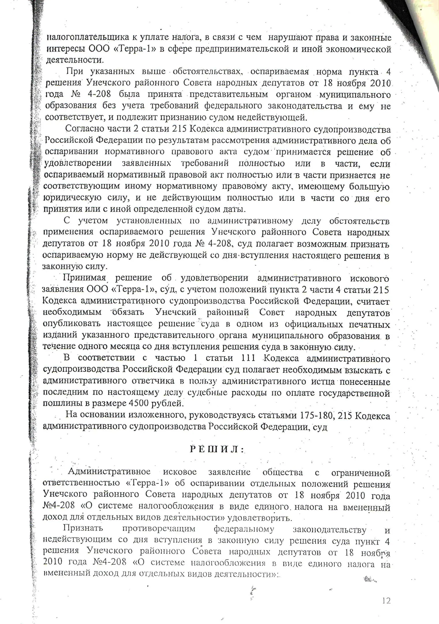 В конце 2016 г. мне пришлось участвовать в судебном оспаривании решения Унечского районного Совета народных депутатов от 18.11.2010 г. № 4-208 «О системе налогообложения в виде единого налога на вмененный доход для отдельных видов деятельности» в части пункта 4, содержащего вышеназванное правило. Дело рассматривалось в областном суде по первой инстанции. Ответчик (районный СНД), возражая против иска, ссылался также на то, что данный муниципальный правовой акт прошел экспертизу и не вызвал никаких замечаний у прокуратуры. Эти доводы были поддержаны представителями ФНС по Брянской области. Тем не менее суд признал данное решение в оспариваемой части противоречащим федеральному законодательству и недействующим. Верховный Суд РФ данное решение оставил в силе, отказав райсовету в удовлетворении его апелляционной жалобы.