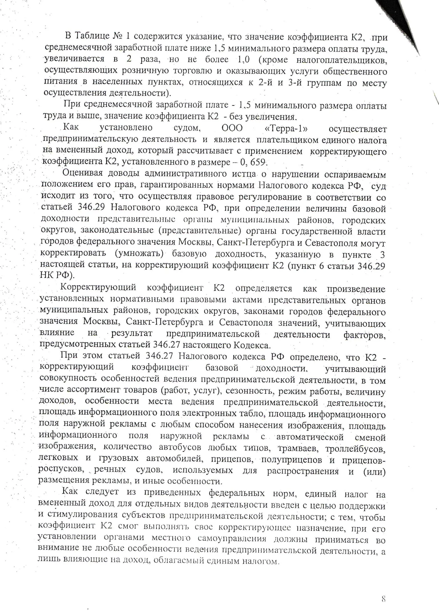 Теперь перехожу к самой сути вопроса. Думаю не ошибусь, если скажу, что в большинстве (если не во всех) муниципальных районах и городских округах приняты муниципальные правовые акты о системе налогообложения в виде единого налога на вмененный доход для отдельных видов деятельности, которые содержат норму, устанавливающую порядок ежеквартальной корректировки установленного значения коэффициента К2 в зависимости от соотношения между размером среднемесячной заработной платы на одного работника среднесписочной численности за отчетный период (квартал) и величиной минимального размера оплаты труда. При этом, если среднемесячная заработная плата на одного работника среднесписочной численности ниже 1,5 минимального размера оплаты труда, значение корректирующего коэффициента К2 увеличивается в 2 раза, но не более 1,0. И такие нормы местные власти принимаются в нарушение требований и ограничений, установленных п. 6 ст. 3 и п. 7 ст. 346.29 НК РФ. Объясняют свои действия очень просто: такое решение необходимо для легализации заработной платы, а также увеличения собственных доходов бюджета.