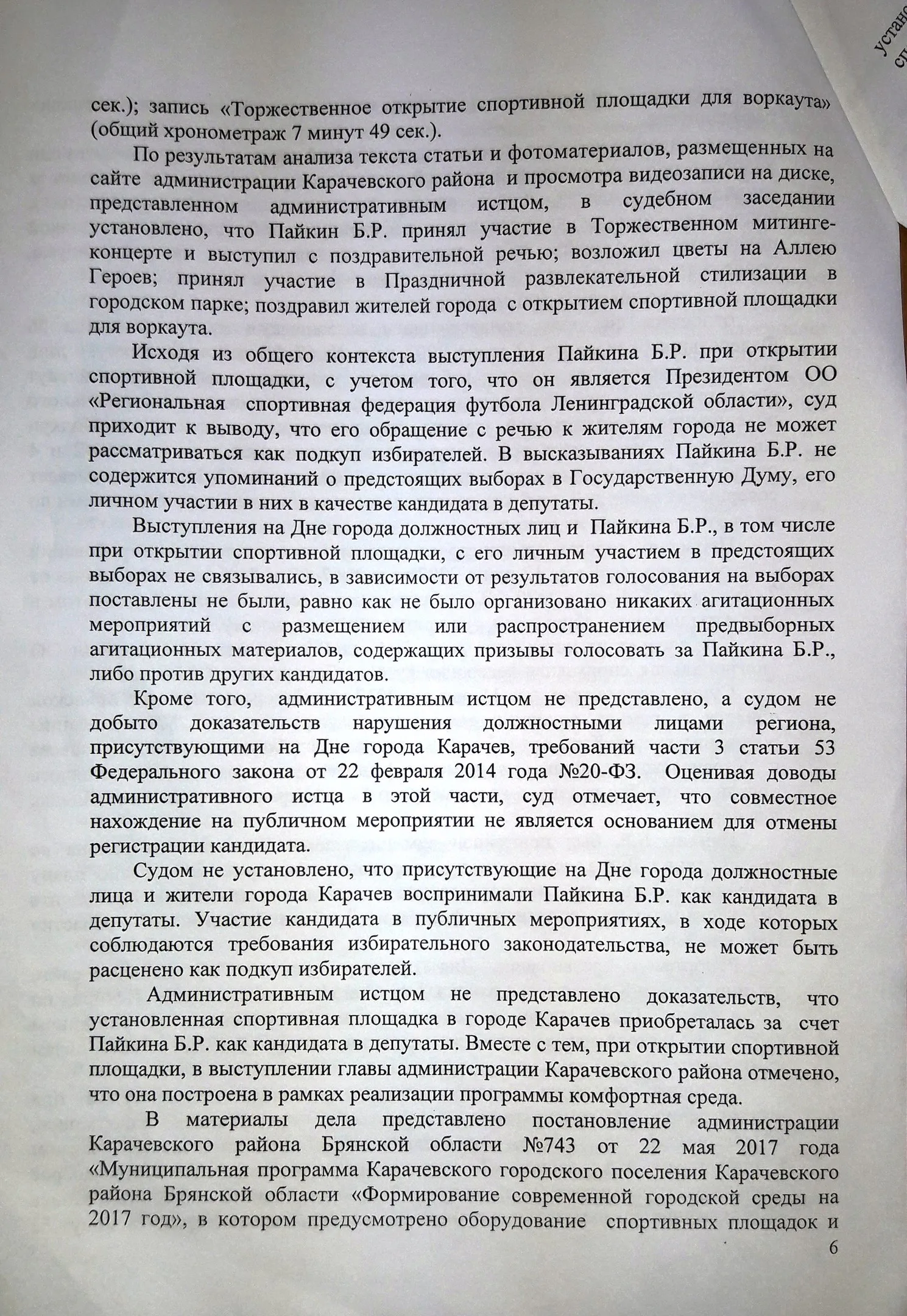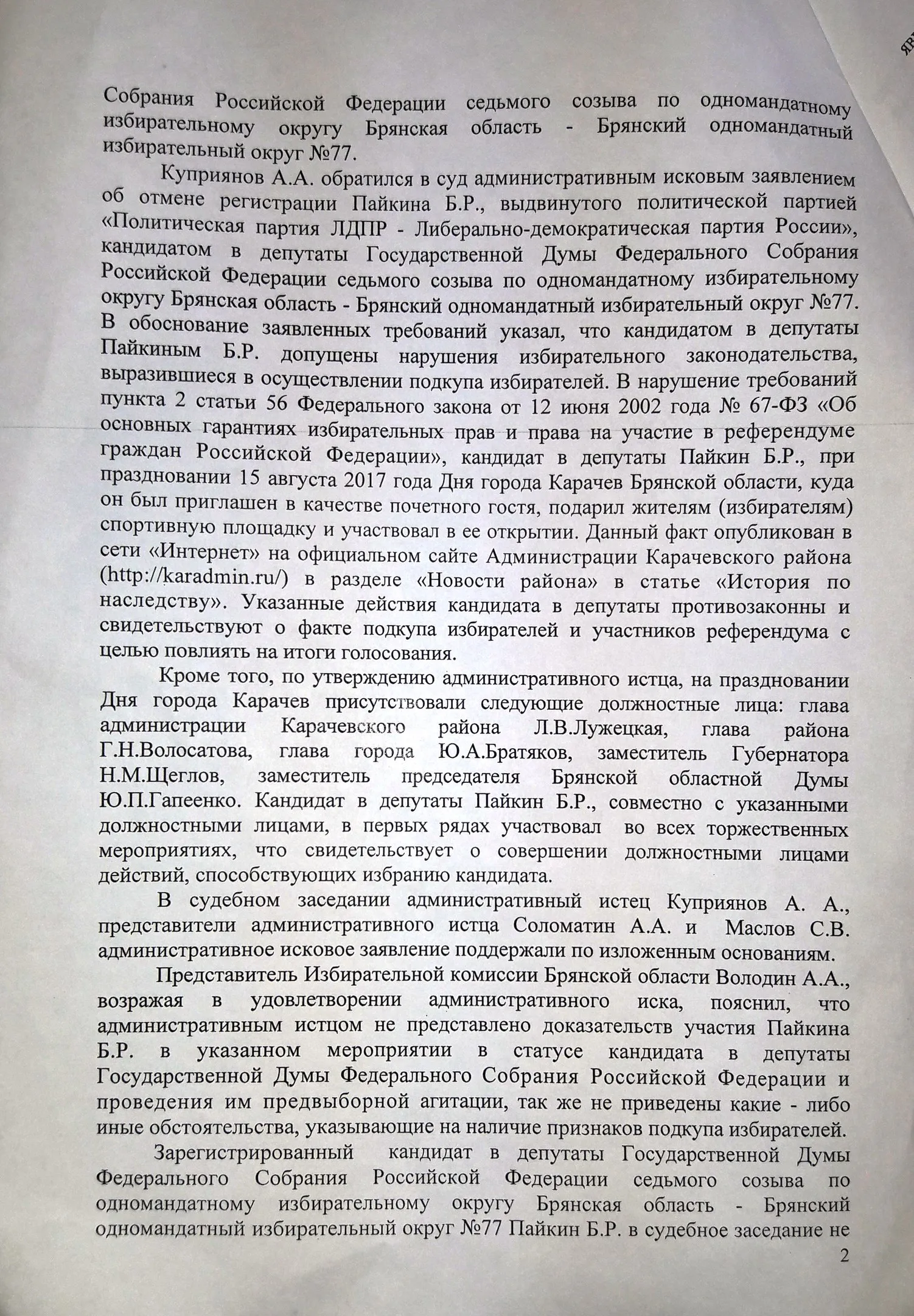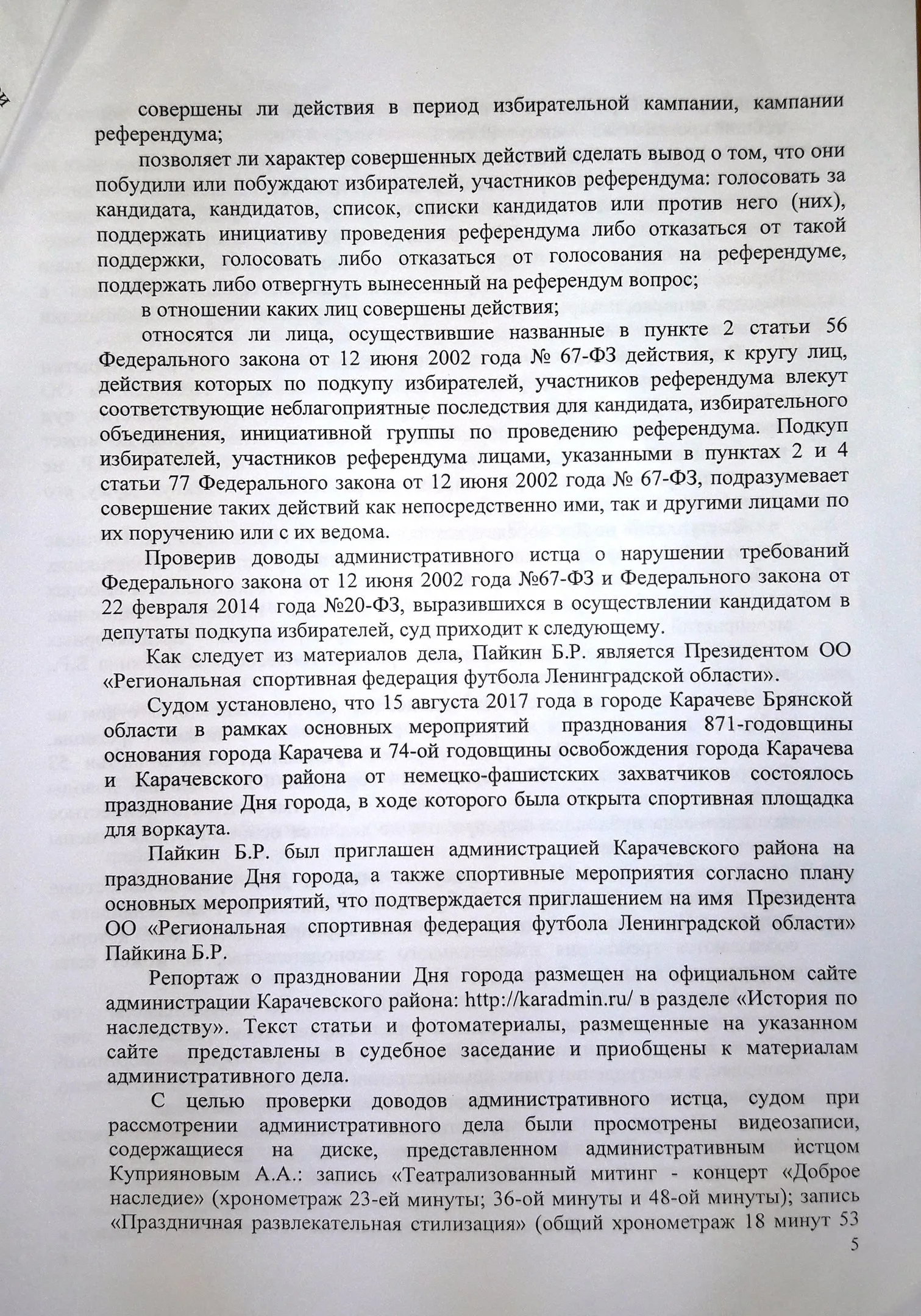 Особого внимания заслуживает следующее событие. 15 августа 2017 года в городе Карачеве Брянской области в рамках основных мероприятий празднования 871-й годовщины основания города Карачева и 74-ой годовщины освобождения города Карачева и Карачевского района от немецко-фашистских захватчиков состоялось празднование Дня города, в ходе которого была открыта спортивная площадка для воркаута. Пайкин Б. был приглашен администрацией Карачевского района на празднование Дня города. На празднике также присутствовали глава администрации Карачевского района Л.В. Лужецкая, глава района Г.Н.Волосатова, глава города Ю.А. Братяков, заместитель Губернатора Н.М. Щеглов, заместитель председателя Брянской областной Думы Ю.П. Гапеенко. Слова благодарности главы администрации Карачевского района Л.В. Лужецкой в адрес Пайкина Б. по поводу открытия спортивной площадки давали основания полагать, что этот спортивный объект появился именно благодаря оказанной Пайкиным Б. финансовой помощи. Указанные действия, совершенные кандидатом в депутаты Пайкиным Б. в агитационный период, могли быть расценены как подкуп избирателей в смысле, придаваемом этому понятию в п. 2 ст. 56 Федерального закона от 12 июня 2002 года N 67-ФЗ, что давало основание для отмены его регистрации в качестве кандидата в депутаты по основаниям п.п. "г" п. 7 ст. 76 Федерального закона от 12 июня 2002 года N 67-ФЗ.