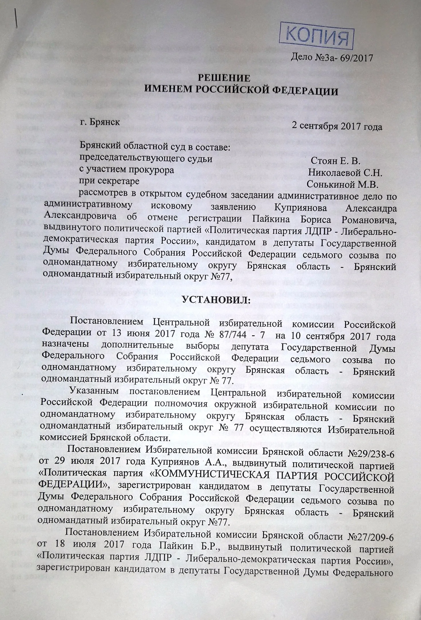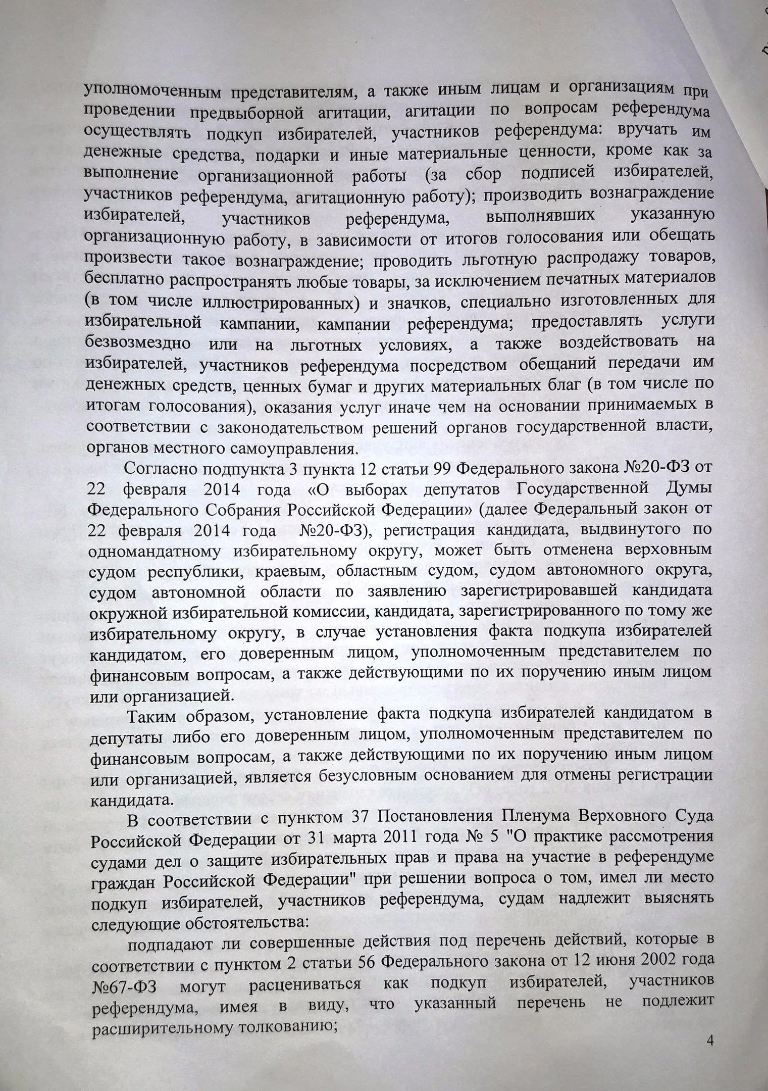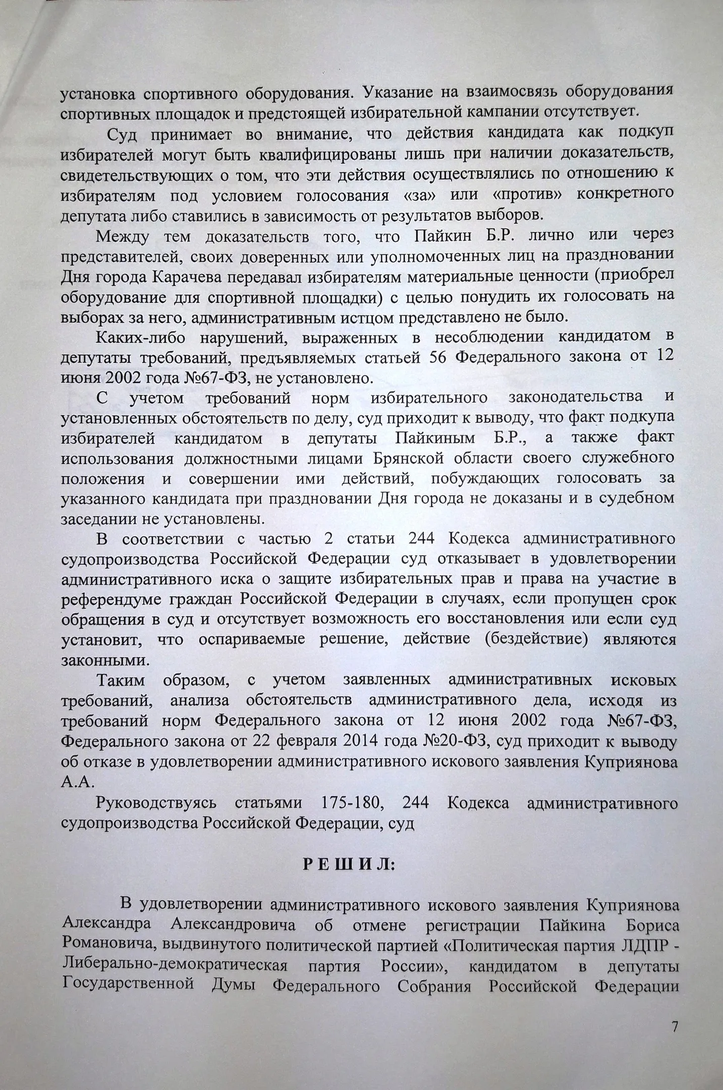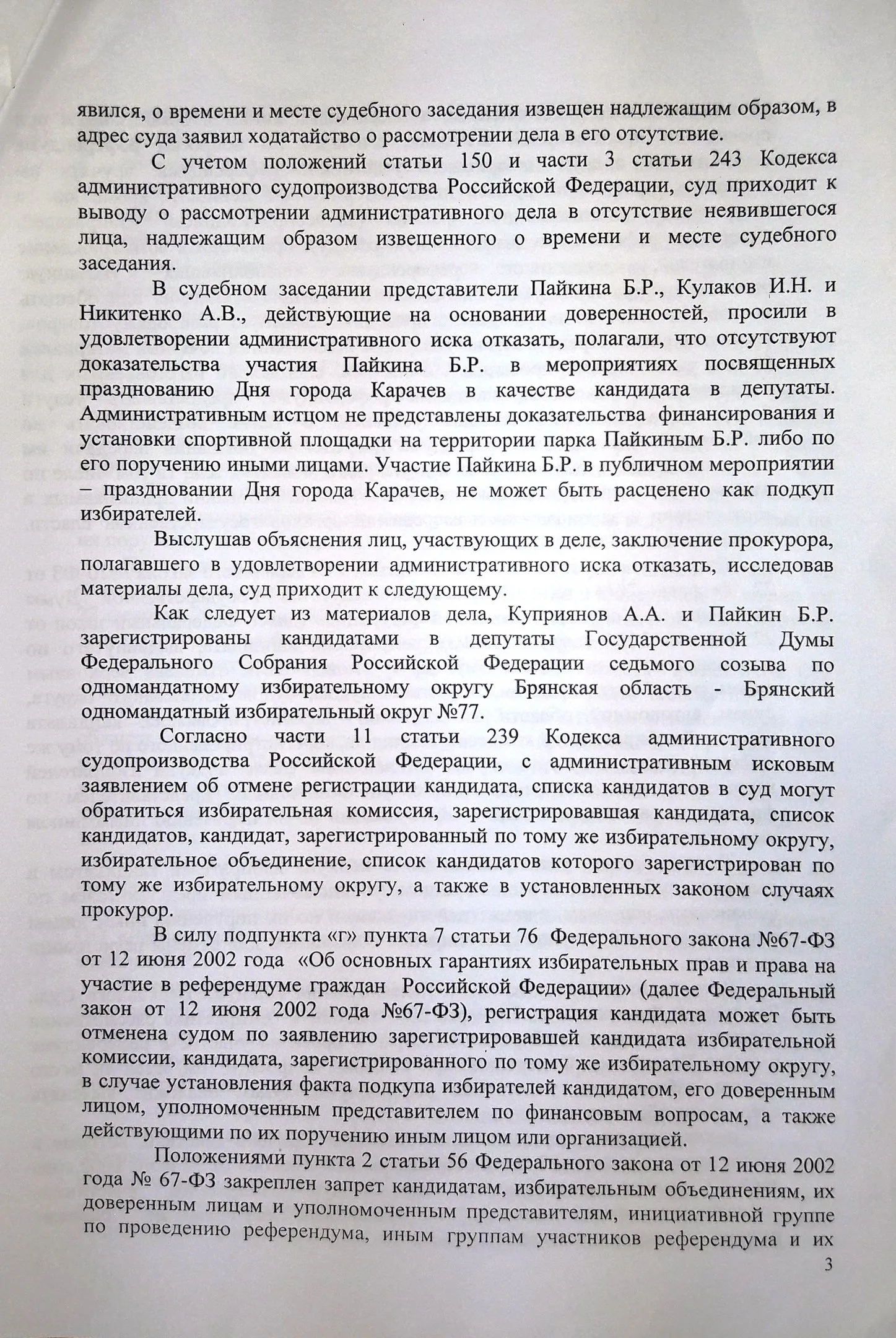 Особого внимания заслуживает следующее событие. 15 августа 2017 года в городе Карачеве Брянской области в рамках основных мероприятий празднования 871-й годовщины основания города Карачева и 74-ой годовщины освобождения города Карачева и Карачевского района от немецко-фашистских захватчиков состоялось празднование Дня города, в ходе которого была открыта спортивная площадка для воркаута. Пайкин Б. был приглашен администрацией Карачевского района на празднование Дня города. На празднике также присутствовали глава администрации Карачевского района Л.В. Лужецкая, глава района Г.Н.Волосатова, глава города Ю.А. Братяков, заместитель Губернатора Н.М. Щеглов, заместитель председателя Брянской областной Думы Ю.П. Гапеенко. Слова благодарности главы администрации Карачевского района Л.В. Лужецкой в адрес Пайкина Б. по поводу открытия спортивной площадки давали основания полагать, что этот спортивный объект появился именно благодаря оказанной Пайкиным Б. финансовой помощи. Указанные действия, совершенные кандидатом в депутаты Пайкиным Б. в агитационный период, могли быть расценены как подкуп избирателей в смысле, придаваемом этому понятию в п. 2 ст. 56 Федерального закона от 12 июня 2002 года N 67-ФЗ, что давало основание для отмены его регистрации в качестве кандидата в депутаты по основаниям п.п. "г" п. 7 ст. 76 Федерального закона от 12 июня 2002 года N 67-ФЗ.