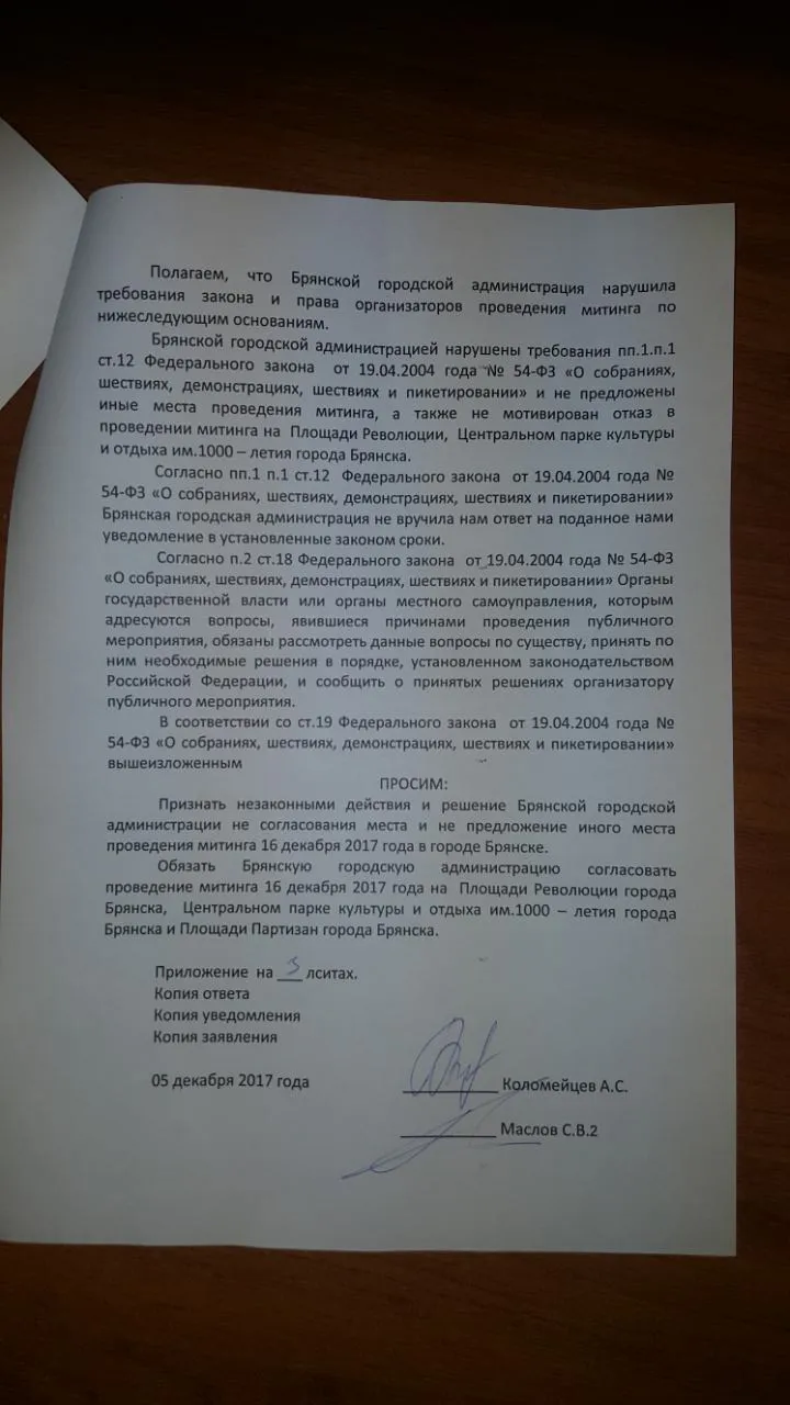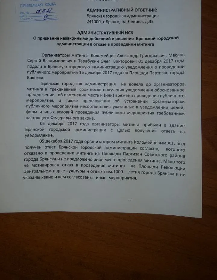 Организаторы митинга обжаловали ответ в судебном порядке, сегодня ими подан административный иск о признании незаконными действий и решения Брянской городской администрации в отказе в проведении митинга. Истцы просят обязать администрацию согласовать место проведения митинга.
