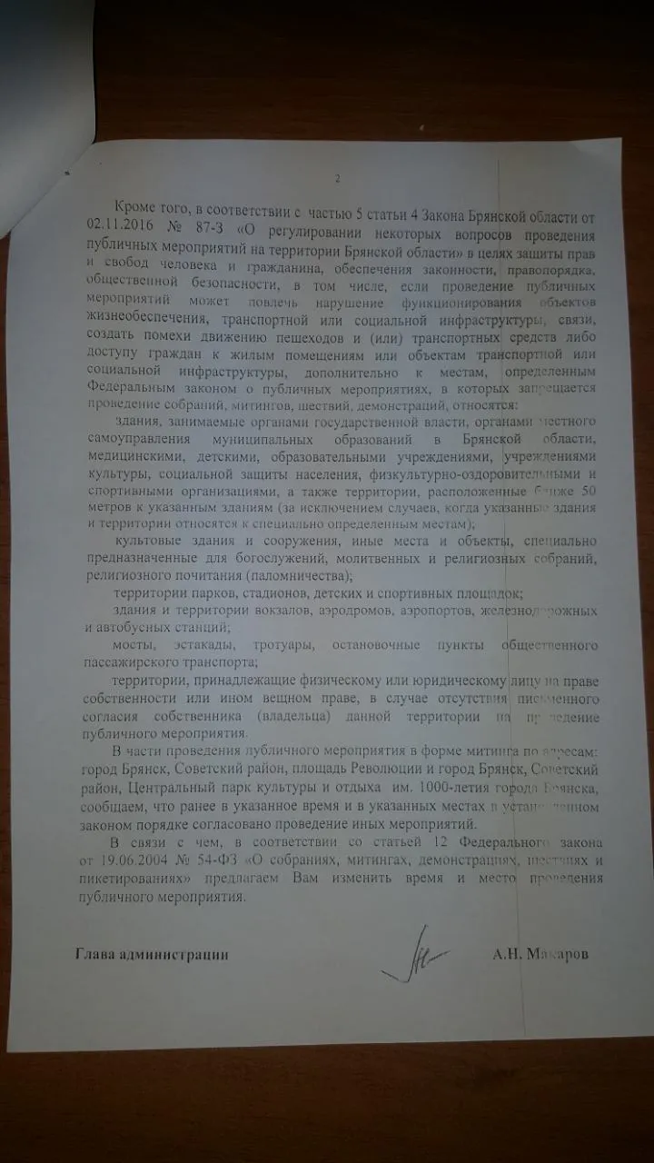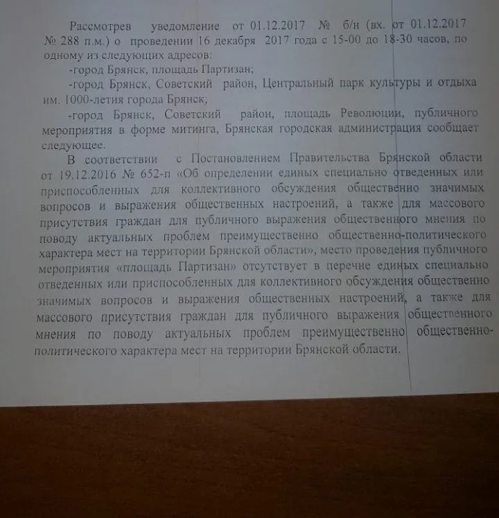 Мы уже сообщали о предстоящем митинге против Губернатора Брянской области Александра Богомаза, который запланирован на 16 декабря. Сегодня организаторам поступил ответ от Брянской городской администрации, в котором власти отказывают в проведении митинга.