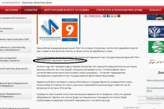 Далее сообщается, что «Масштабная международная акция «Тест по истории Отечества» состоится 9 декабря в третий раз и охватит все регионы России, а также около 40 зарубежных стран. Организаторами акции выступают Молодежный парламент при Государственной Думе ФС РФ и Молодежный парламент Брянской области».