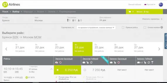 Однако, судя по информации сайта компании-авиаперевозчика по состоянию на 18 декабря свободные места всё же есть. Только цена вовсе не 5 рублей, как завлекательно сообщают в правительстве Брянской области. На рейс 24 декабря из Брянска можно приобрести билеты за 6250 и 7250 рублей.