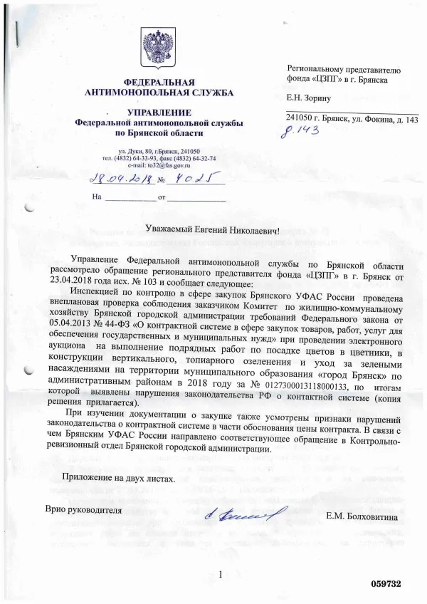 По данному вопросу региональное представительство федерального фонда "Центр защиты прав граждан" направило письмо в Управление антимонопольной службы по Брянской области (УФАС). Несмотря на то, что выявленные нарушения были признаны не влияющими на итоги рассматриваемой закупки, решается вопрос о возбуждении административного правонарушения, ответственность за которое предусмотрена административной статьей - "Утверждение конкурсной документации, документации об аукционе, документации о проведении запроса предложений, определение содержания извещения о проведении запроса котировок с нарушением требований, предусмотренных законодательством".