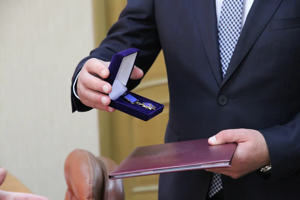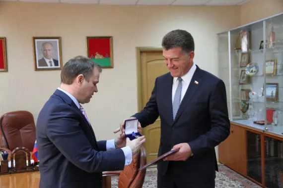 Диплом и Почётный золотой знак Главе города Александру Хлиманкову вручил руководитель Клуба Михаил Ошлаков.