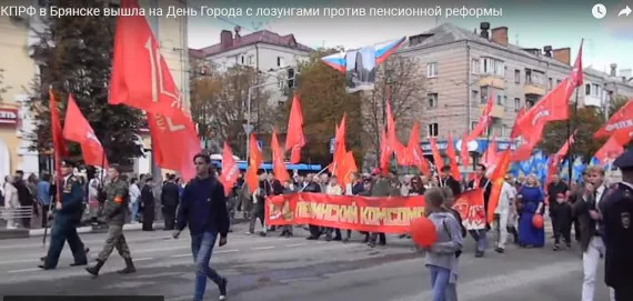 Сегодня, во время традиционного Парада Поколений, посвященного 75-й годовщине освобождения Брянска от немецко-фашистских захватчиков, колонна брянского отделения КПРФ шла с лозунгами против пенсионной реформы.
