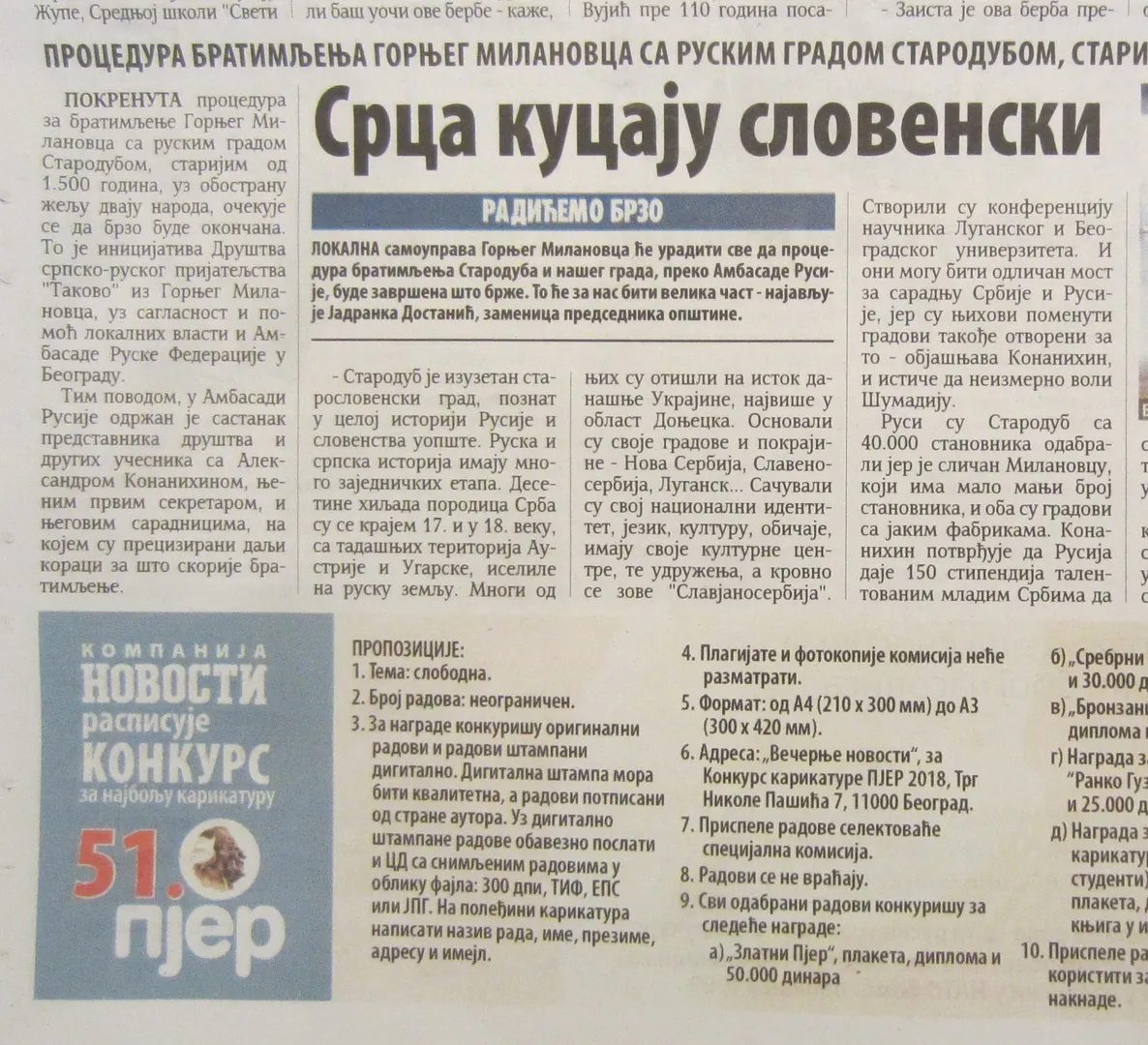 Скоро у брянского Стародуба появится еще один город-побратим. Им станет сербский Горни-Милановац.