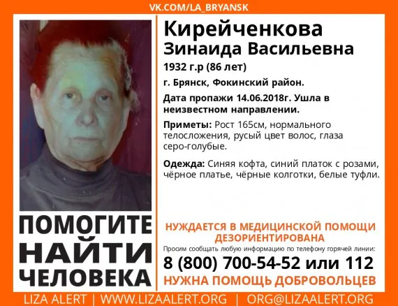 В Брянске ищут 86-летнюю местную жительницу Зинаиду Кирейченкову, сообщают в поисковом отряде «Лиза Алерт».
