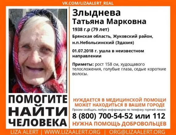 На Брянщине больше недели ищут 79-летнюю Татьяну Злыдневу