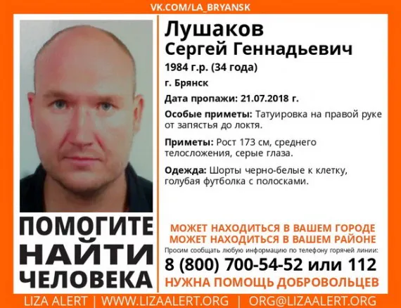 С 21 июля в Брянске ищут 34-летнего местного жителя Сергея Лушакова, сообщают в поисковом отряде «Лиза Алерт».