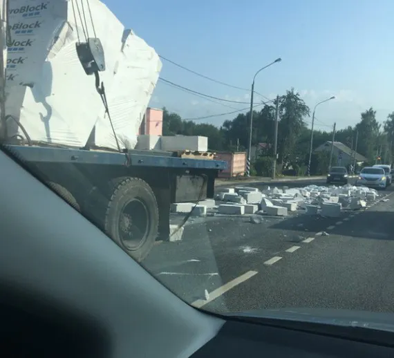 Причиной затора стали пеноблоки, которые выпали на дорогу из КамАЗа. Уточним, что никто не пострадал - машин рядом не оказалось.