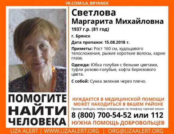 В Брянске ищут 81-летнюю местную жительницу Маргариту Светлову: женщина пропала 15 августа и с тех пор информации о её местонахождении нет, сообщает поисковый отряд «Лиза Алерт».