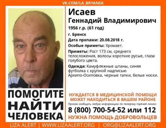 20 августа в Брянске пропал 61-летний местный житель Геннадий Исаев, сообщают в поисково-спасательном отряде «Лиза Алерт».