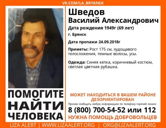 В Брянске нашли пропавшего 69-летнего местного жителя Василия Шведова, сообщили в поисковом отряде «Лиза Алерт».