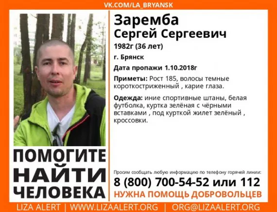 1 октября в Брянске пропал 36-летний Сергей Заремба