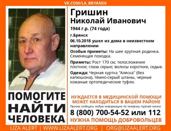 В минувшую субботу в Брянске пропал 74-летний Николай Гришин, сообщают в поисковом отряде «Лиза Алерт».