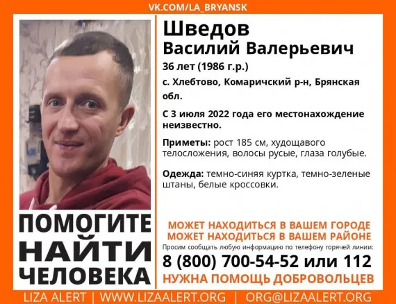 В Брянске ищут 36-летнего Василия Шведова. С 3 июля 2022 года её местонахождение неизвестно. Об этом сообщили в соцсети ВКонтакте, в сообществе «Лиза Алерт» сегодня, 14 июля.