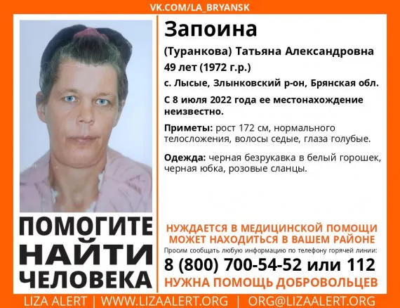 В Брянске ищут 49-летнию Татьяну Запоину. С 8 июля 2022 года её местонахождение неизвестно. Об этом сообщили в соцсети ВКонтакте, в сообществе «Лиза Алерт» сегодня, 18 июля.