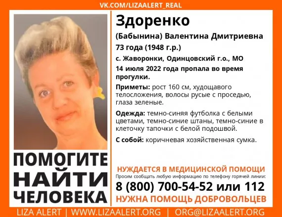 В Брянске ищут 73-летнию Валентину Здоренко. С 14 июля 2022 года её местонахождение неизвестно. Об этом сообщили в соцсети ВКонтакте, в сообществе «Лиза Алерт» сегодня, 20 июля.