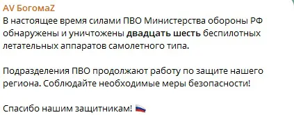Сегодня ночью силами ПВО было уничтожено 26 бпла. Часть над городом, как сообщают жители был слышен грохот и свист.