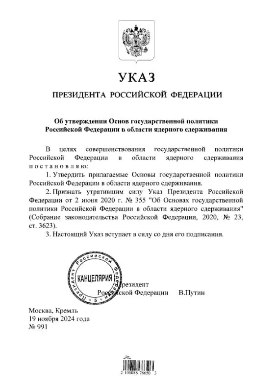 Напомним, что ранее 19 ноября утверждена новая ядерная доктрина России в рамках которой по сути при нанесении таких которые нанесены наша страна может применить ядерной оружие.
