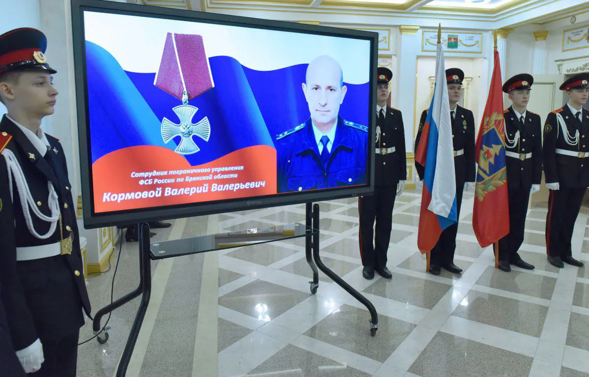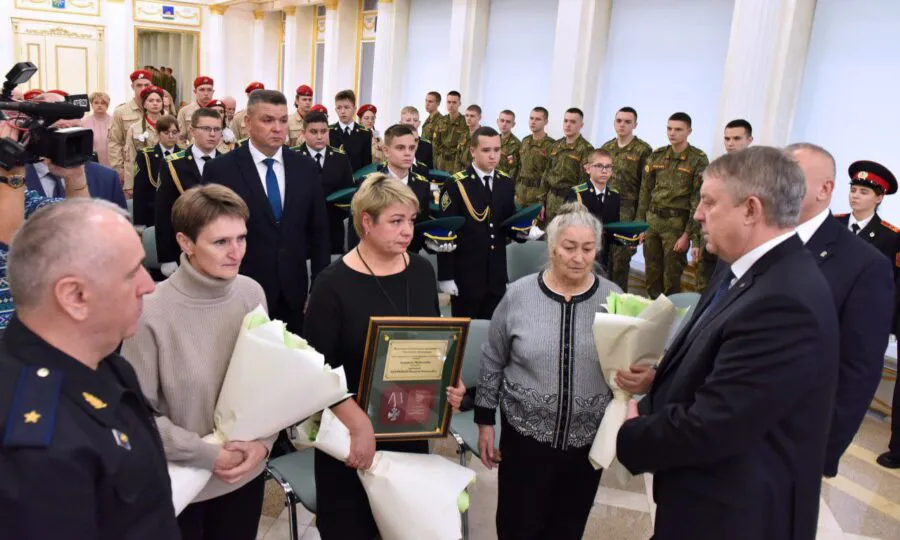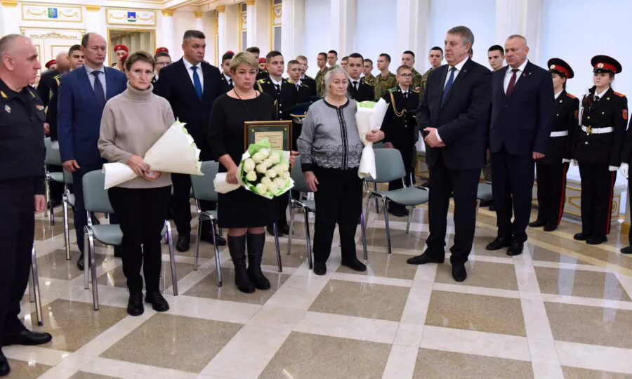 Государственную награду близким Героя супруге Татьяне Евгеньевне, его маме Марии Васильевне и сестре Татьяне Валерьевне передал Губернатор области Александр Богомаз вместе с начальником Пограничного управления ФСБ России по Брянской области генерал-майором Амиром Амировым
