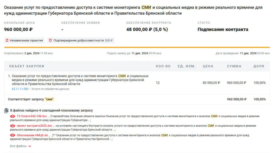 Но в это же самое время Администрация губернатора брянской области и правительство брянской области готовы заказать за 960 000 рублей годовую подписку на систему, которая может мониторить СМИ в реальном времени.