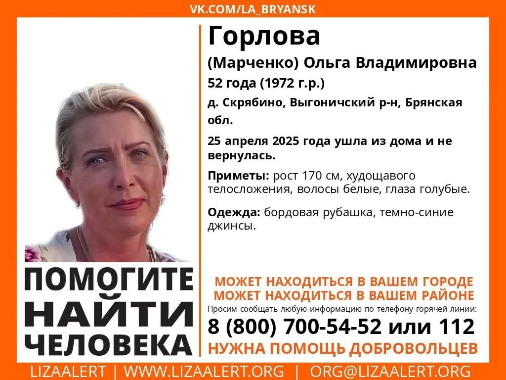 Родные и близкие ищут пропавшую Ольгу Владимировну Горлову (Марченко), ей 52 года 25 апреля ушла из дома и не вернулась, обеспокоенные родные и близкие просят сообщать любую информацию по телефонам 88007005452 (Горячая линия ЛА) или 02, 102 (полиция).