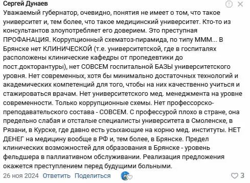 Причем показательно, что команда Богомаза с ним во главе сейчас активно продвигает проект по строительству Филиала Первого Московского государственного медицинского университета имени И. М. Сеченова, что должно вроде как закрыть повестку разваливающейся медицины перед выборами. По этому поводу хотим привести мнение нашего читателя, Сергея Дунаева который на наш взгляд неплохо охарактеризовал эту стройку и перспективы ее для региона:
