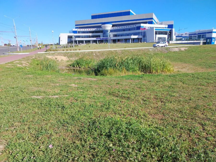 Зрителей на подходе встречает грязная лужа, не засыхающая все лето и поросшая подобием камыша с торчащими палками и мусором. Это как нужно было делать проектные работы, что бы допустить такое в на многомиллиардном объекте, как проходила экспертиза проекта?