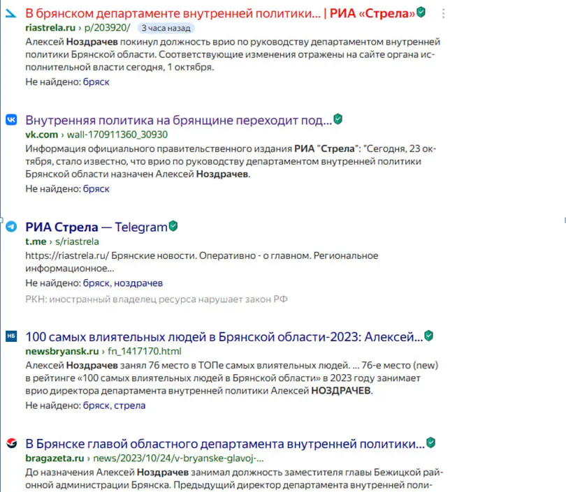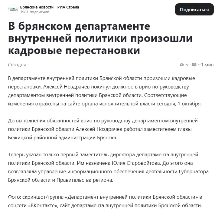 И вот сегодня появилась информация о том, что ее руководитель Ноздрачев снят и заменен на руководителя пресс-службы Богомаза Юлию Старовойтову. Причем статья об этом вроде как появилась на подконтрольном государственном ресурсе РИА Стрела. Почему это не точно? Да просто, судя по всему, ее оттуда оперативно снесли, но бот Яндекса ее успел скопировать и выдать в поиск.