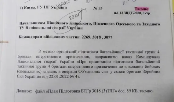 Приказ «Об организации подготовки батальонной тактической группы 4-й бригады оперативного назначения для выполнения боевых (специальных) задач в операции объединенных сил в составе бригады вооруженных сил Украины» адресован начальникам северного киевского, южного одесского и западного территориальных управлений нацгвардии Украины.