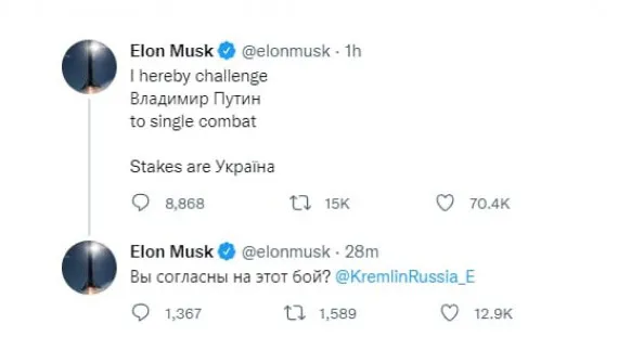 Американский инженер и предприниматель Илон Маск вызвал на поединок Президента России Владимира Путина.