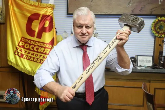 Сергей Миронов, депутат "Справедливой России", показал подаренную ему от коллектива "Вагнера" кувалду.